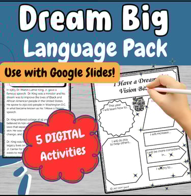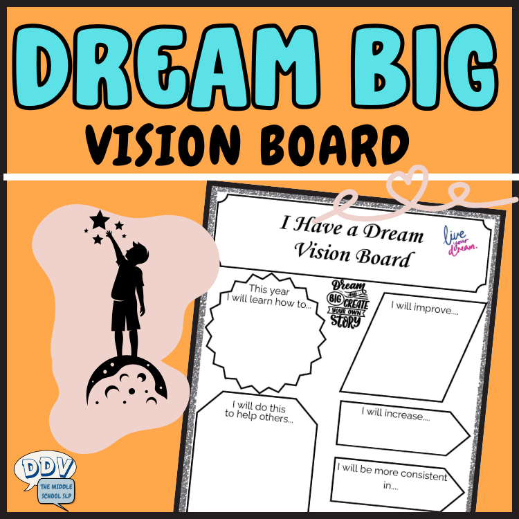 3 ways to use this no prep activity for middle school speech therapy students. This Dream Big packet has a digital & printable format to target vocabulary, creative writing, & reading comprehension all in one.