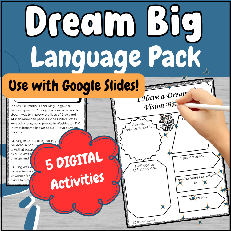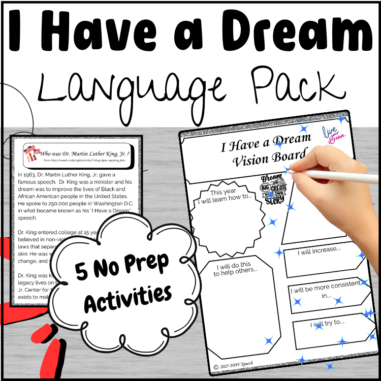 For classrooms where you push in as an SLP and lead whole groups or centers, use the Dream Big Vision board along with the reading about Dr. King's speech.
