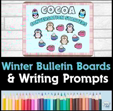This bulletin board set includes an aesthetic color combo of pink, aqua, and navy. It is a perfect, versatile kit for winter bulletin boards that includes student writing prompts. This set has 35 titles and writing prompt ideas you can adapt for your own class. I created an "Keep it cool" version of this and had students discuss self-regulation strategies.